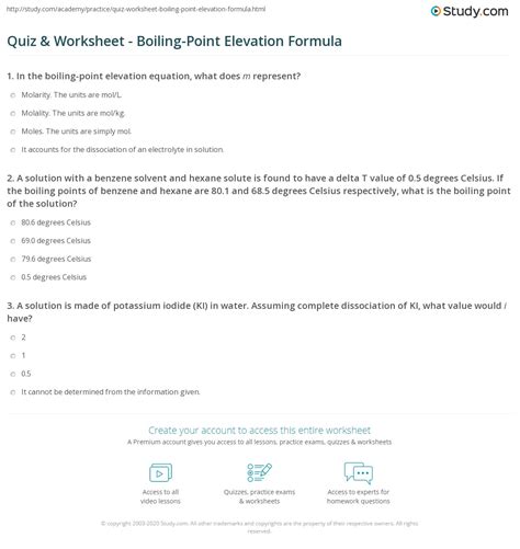 Boiling Point Elevation Worksheet - What is the molecular mass of an organic compound if 16.00 g of the compound is dissolved in 225.0 g of carbon tetrachloride. This small set of properties is of central. What is the boiling point of a solution prepared by adding 29.3 g of methanol. Practice problems on the colligative properties of solutions covering the freezing point depression, boiling.